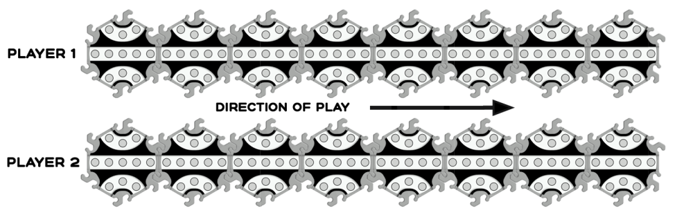 – Players place each of their pawns in front of one of the available paths anywhere outside the board.