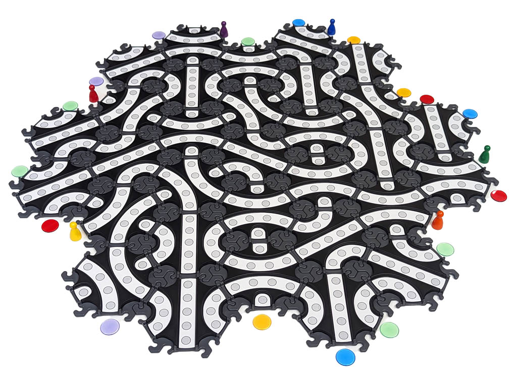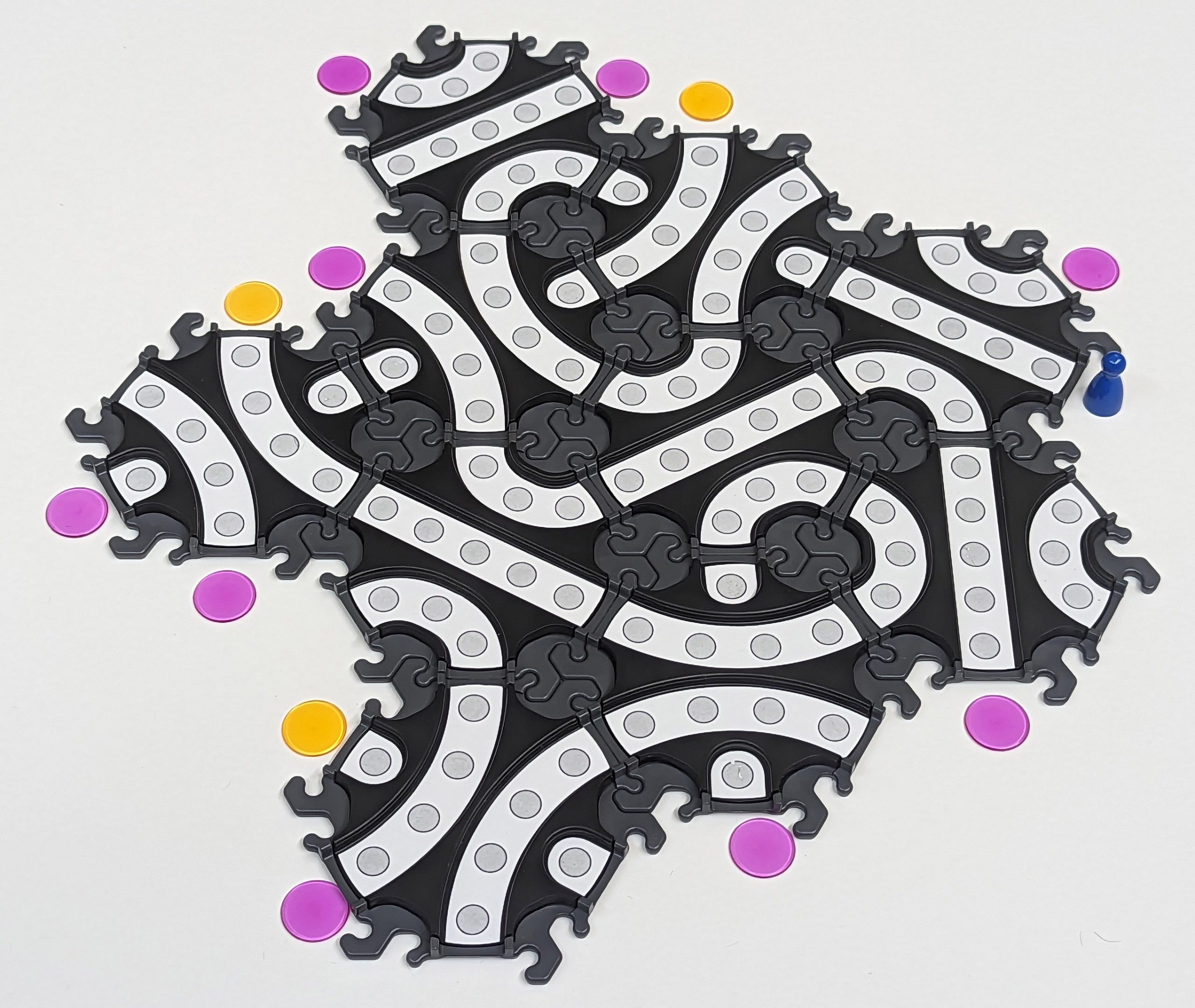 The object of the game is to identify game board configurations that have connections to every path in as few moves as possible. After configurating the board and placing your “player marker” (i.e. dice) at your chosen starting position, start placing “reach markers” (i.e. pawns) just outside any path that is connected to the player marker. Rotate tiles to connect different paths and keep adding reach markers as needed. Keep track of the times you rotate tiles. At any point, you can move your player marker to a location that is currently connected. Keep track of these moves. Once you reach all possible locations outside the board, take note of the number of rotations and moves you made. Try reverting back to the original setup and try different starting position and rotations to lower the number of moves and rotations to achieve the goal.