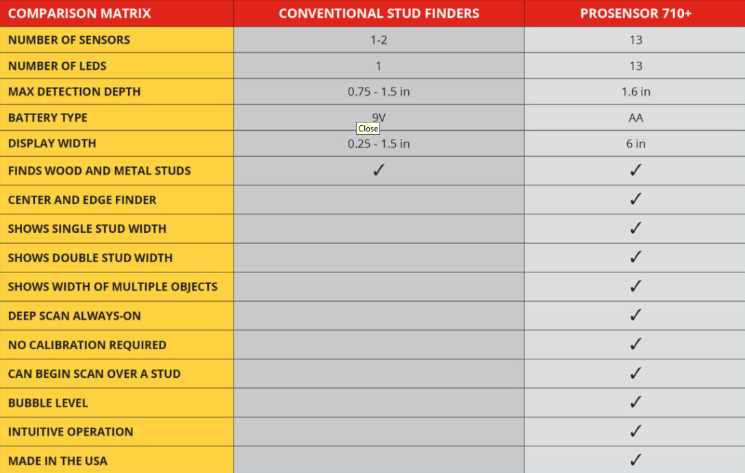 | Short Description | The ProSensor 710+ has 13 precision sensors. In comparison, conventional stud finders have 1 or 2 sensors. With more sensors, the ProSensor 710+ more accurately identifies any change in density and identifies hidden objects behind the wall. |