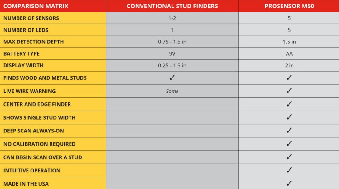 | Short Description | The ProSensor M50 has 5 precision sensors. In comparison, conventional stud finders have 1 or 2 sensors. With more sensors, the ProSensorM50 more accurately identifies any change in density and identifies hidden objects behind the wall.