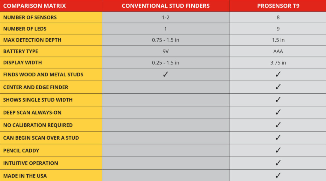 | Short Description | The ProSensor T9 has 8 precision sensors. In comparison, conventional stud finders have 1 or 2 sensors. With more sensors, the ProSensor T9 more accurately identifies any change in density and identifies hidden objects behind the wall. |