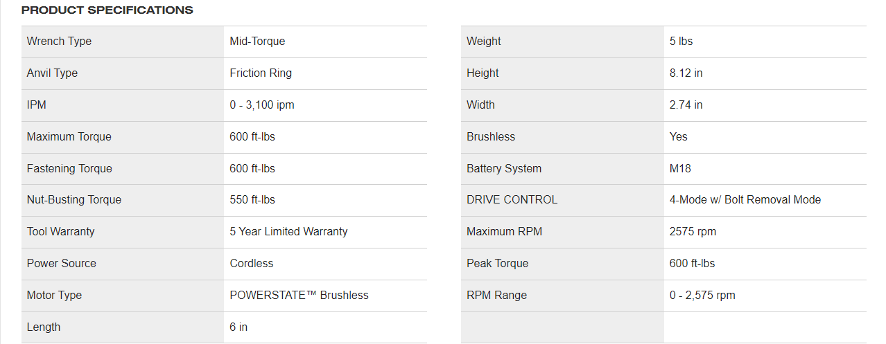Best power to weight ratio is offered as the tool provides 600 ft-lbs. of nut-busting torque at only 5.0 lbs. with a 5.0Ah battery.