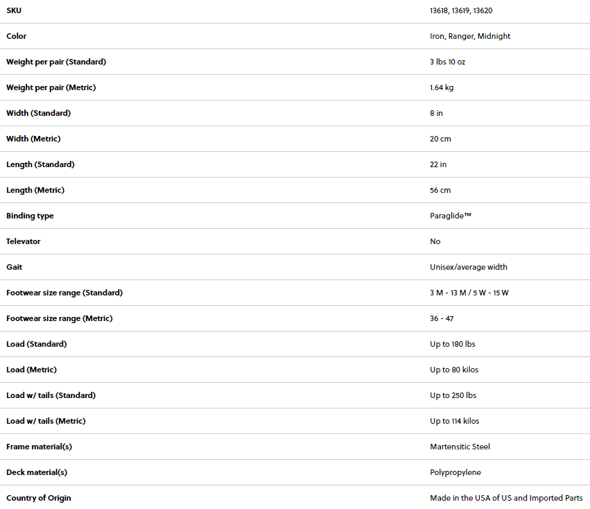 | Short Description | Durable and easy to use, the Evo Trail snowshoes are ready for years of adventures. The UniBody frames and steel traction rails offer the essential grip needed for even modest slopes in less than ideal conditions, while Paraglide™ bindings are easy to use and incredibly comfortable. The pressure point-free stretch mesh securely hugs your feet and is compatible with nearly any footwear. MSR snowshoes are designed, engineered and made to exacting standards in the USA with the highest quality U.S. and imported materials to perform reliably in winter conditions. Easy to use, durable and comfortable for flat trails or rolling hills.