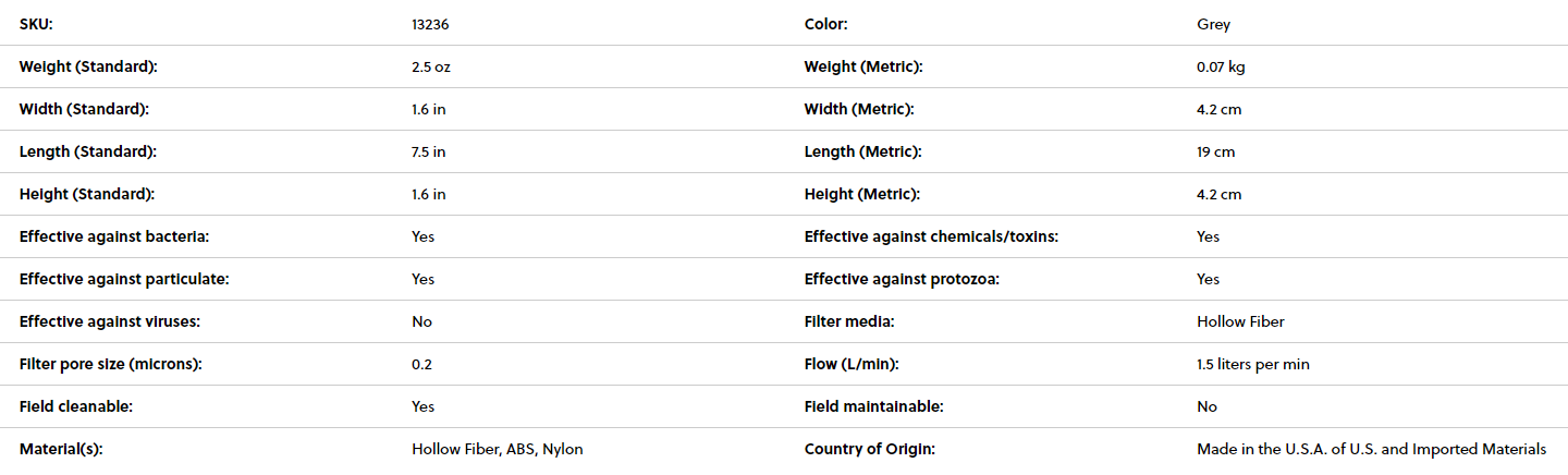 Adding minimal gear to your pack, the Thru-Link inline filter is the simplest solution to clean water on the go. Just click it into your hydration reservoir and you’re ready to filter as you drink and hike. Engineered for high-flow drinking, it makes it easy to stay hydrated on long day hikes and fast-paced missions. The filter is compatible with any reservoir system, and uses both hollow fiber technology and activated carbon to provide reliable, safe and taste-free water. At camp, the Thru-Link lets you use your reservoir as a gravity system for the luxury of pump-free filtration.