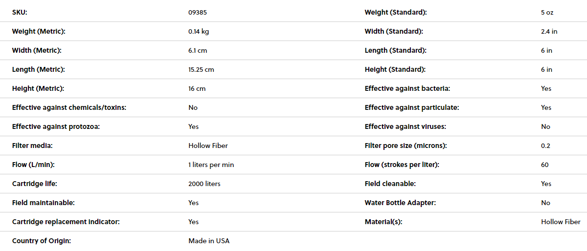 | Short Description | Clean water all day—without the weight. That’s the advantage the TrailShot Microfilter provides. Designed to hide in stash pockets and deploy quickly, this tiny water filter lets you drink directly from sources along the trail for instant hydration, and fill your vessels with clean water. Easy one-handed operation filters one liter in a mere 60 seconds, so you can get back on the trail quickly and moving again. At just 142 g (5 oz.), the TrailShot water filter is the ultimate filter for fast-paced, high-mileage adventurers, like trail runners, hikers, fast-packers and mountain bikers. The smartest solution to clean water on fast-paced adventures.